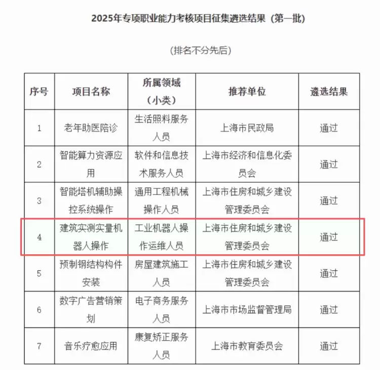 “建筑实测实量机器人操作技术员”专项能力考核,已正式跻身2025年首批专项职业能力考核目录,且是建筑机器人类别中的唯一入选项目。此举确立了该岗位的专业标准,从业人员经考核合格后,将由人社部门授予相应证书,为其职业化与规范化发展奠定基础。