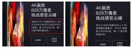 而近日,坚果刚刚发布的4K激光电视坚果U1更是故技重施。在坚果U1预售阶段,坚果天猫详情页写着“凭借400万个微镜利用4K UHD芯片和XPR技术实现了4K的分辨率“。而专业人士指出,坚果U1所用的0.47DMD实际上微镜数只有207万个,远达不到坚果所说的400万个微镜,属于实实在在的虚假宣传。