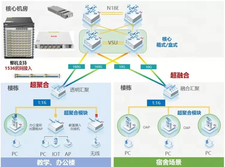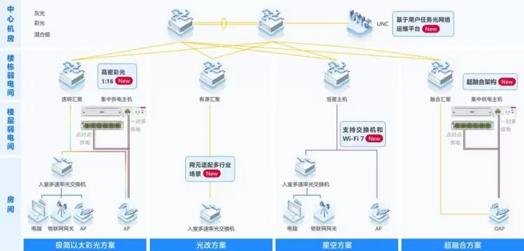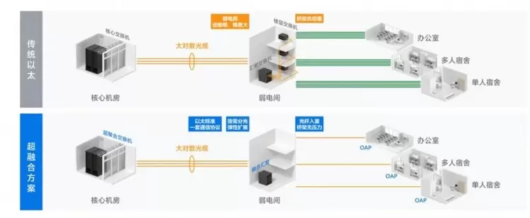 在架构层面,超融合方案依然保持极简以太彩光方案的整体特性,继承以太网架构的多重优势,且依然保持“核心-接入”的大二层架构,不需要单独再部署OLT、BRAS等设备,融合汇聚设备无需强电改造,管理更加简单。