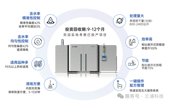 兰浦智能干燥设备,以技术创新给出破局方案:该设备可实现3%的收率(得率)提升,含水率精准控制与均匀性偏差≤2%,且适配市场上95%以上的药材品类,能将每1g药材转化为实实在在的利润,从源头帮企业降低成本损耗。