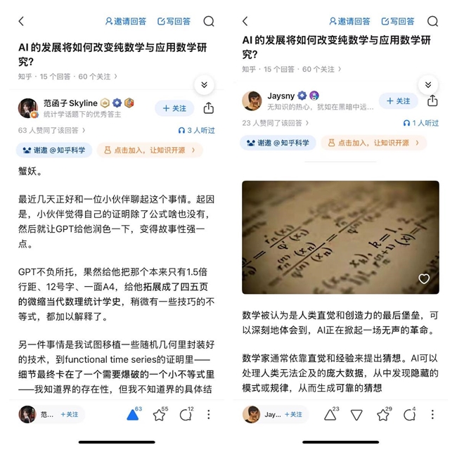 斯坦福大学人文与科学学院名誉讲席教授孙理察,将问题指向了AI与数学的交汇点,“AI的发展将如何改变纯数学与应用数学研究?”。多位答主表达了乐观情绪,知乎答主Jaysny表示,“AI能处理人类无法企及的数据并生成可靠猜想,这正掀起一场‘无声的革命’”,他认为可能会催生一个全新的学科领域—数据科学数学。