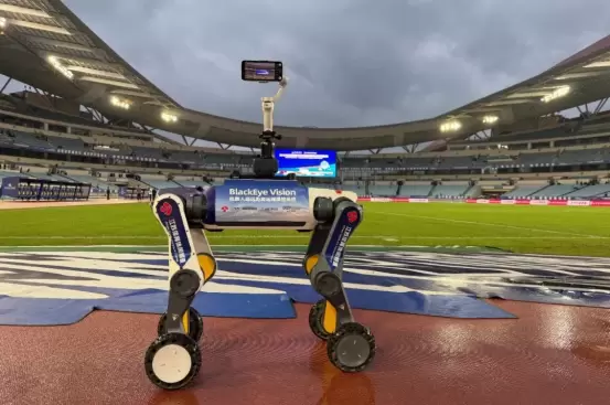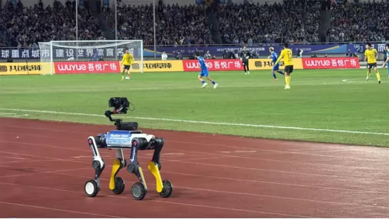 一只由江苏省广播电视总台、当虹科技、云深处科技共同打造的四足机器人,作为独立直播机位全程参与“苏超”半决赛拍摄,完成了业界首次机器狗视角的专业赛事转播。
