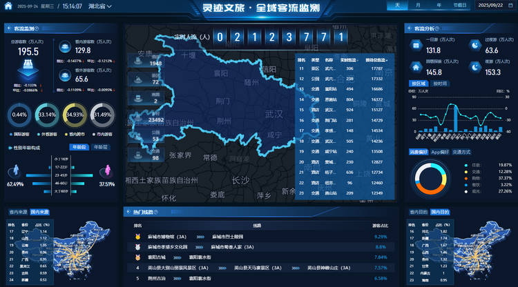 通过“热力图”,可以看到全省景区当前的人数,数据每5分钟自动更新,还可以看到游客在省内各地的流向情况……湖北省旅游数据中心的大屏上,“湖北全域旅游监测平台”正在对全省文旅情况进行实时监测。