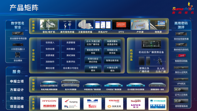 在应急广播场景下,数码视讯能够提供基于直播卫星的端到端解决方案,有效实现应急信息的无死角快速传输覆盖。公司打造了功能全面、运行稳定、形态多样的产品矩阵,包括历经数百项目,多年长久稳定运行考验的平台软件、能够稳定运行十万小时的广电安播级的适配器、采用自研国密标准安全模块的安全终端,也有为探索新应用、新场景而开发的新设备,不断拓展应急广播的覆盖方式与应用领域。以直播星应急广播专用终端为例,设备可按照应急广播规范,完成数据接收、解密、解码,并以音频、图片、字幕的形式输出给外部播放。且该终端支持通过串口、网口与外部设备通讯,并传送应急广播消息及数据给外部设备使用。经过多年的科研和项目实践,数码视讯已经形成了安全可靠、反应灵敏、平战结合、上下联动的应急广播整体解决方案和一站式服务体系,能够帮助客户建设完整的科学、精细、智能化的应急广播系统。