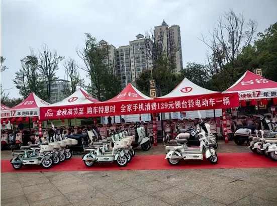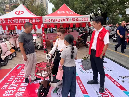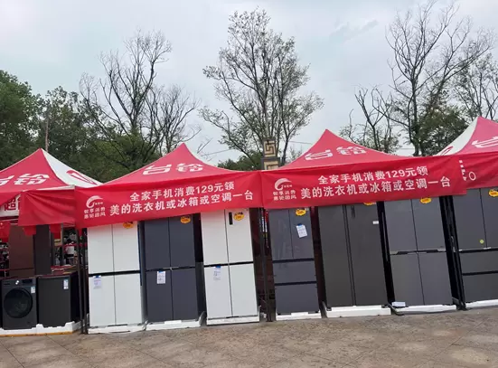活动现场,红色的“台铃”品牌帐篷阵列与团风联通的品牌元素交相辉映。帐篷下,美的洗衣机、冰箱等家电产品与台铃电动车分区陈列,从家庭电器到出行工具的多元布局,构建起一站式消费场景。