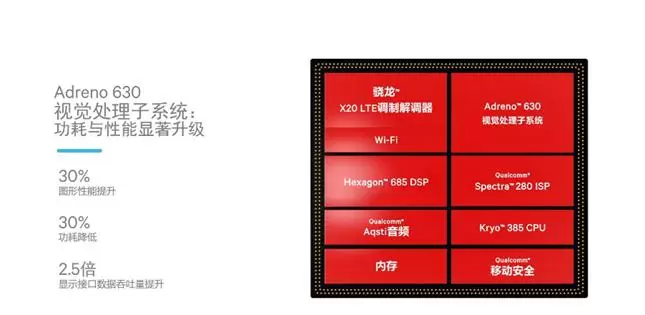 自研GPU Adreno 630采用了全新架构,并且支持六自由度(6DoF)、即时定位和地图构建,这让骁龙845成为了移动级虚拟现实(VR)和增强现实(AR)的一体设备的新标配。