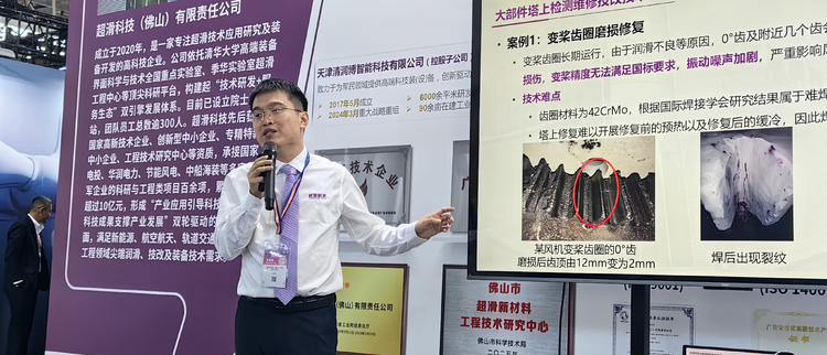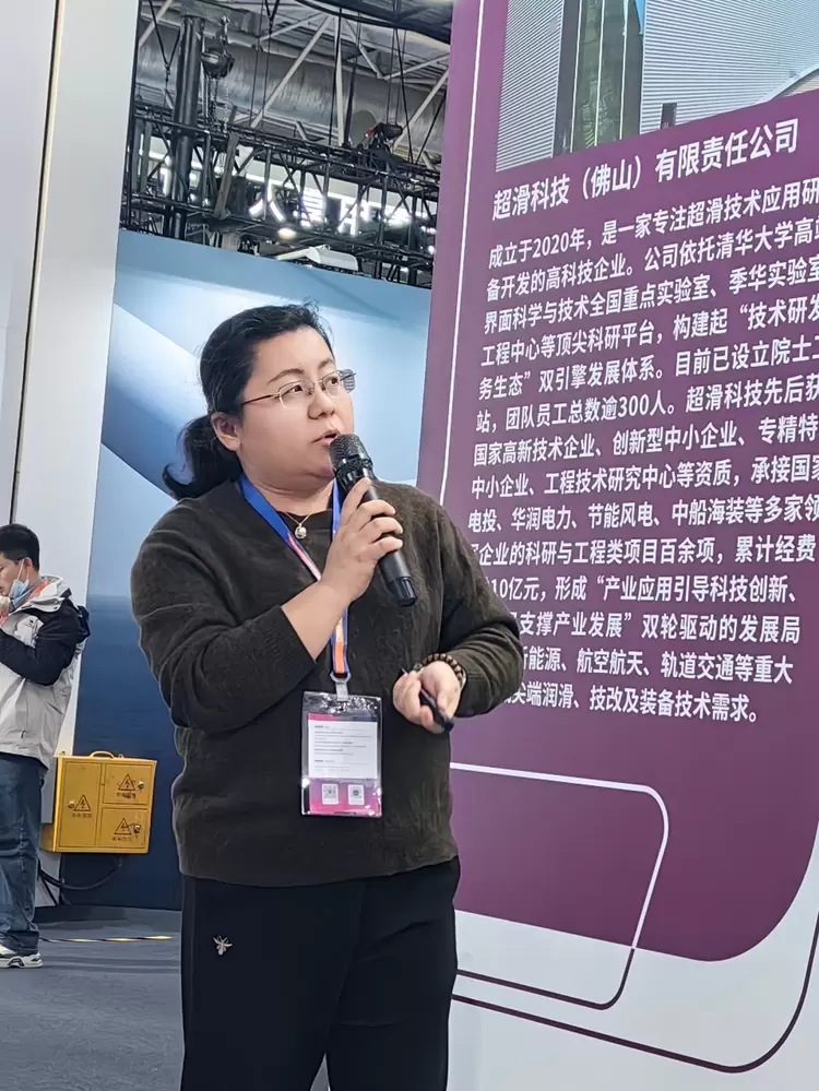 展会期间,超滑科技特设技术分享环节。清华大学天津高端装备研究院润滑技术研究所常务副所长、教授级高工戴媛静以《基于油基超滑理论的低碳型特种润滑油技术与产品开发》为题进行分享,超滑是近年来摩擦学领域发展最快的方向之一,润滑油的摩擦系数为0.01~0.1,而超滑的摩擦系数要比润滑油低一个数量级以上,达到0.001量级或更小。超滑作为一种能将摩擦能耗与磨损率降低几个数量级的变革性技术,在“油基超滑理论”方向开展的基础研究及技术创新成果包括国产风电润滑油、高铁齿轮箱油等。超滑科技副总经理、高级工程师刘洪冰则结合工程案例,介绍了塔上维修关键技术及与清华大学、季华实验室等高校、科研院所合作风电科研服务的产学研合作模式,获得行业专家“切实解决现场运维难题”的高度评价。