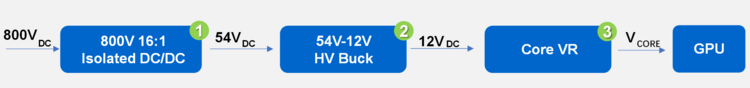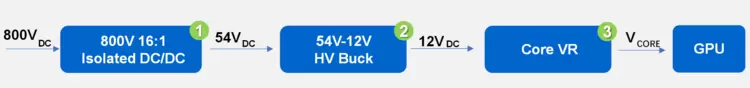 除了向800V机架电源过渡外,800V直流架构还要求在算力机柜内部,从母线到GPU逐级电压转换中实现超高功率密度和超高的转换效率。在英伟达展示的Kyber样机中,单柜NVL576系统内含72个算力托盘,每托盘仅0.5U高,却能提供12kW以上功率,比上一代NVL72系统提升50%功率密度,空间利用率提升4倍。