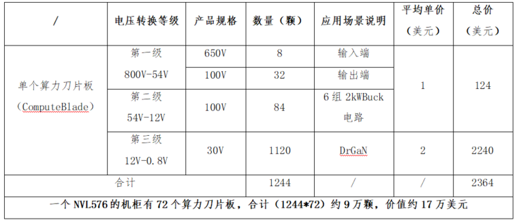 整柜72个算力刀片板约9万颗,再加服务器与NVSwitch部分,总量接近10万颗,单柜GaN价值约18万美元。