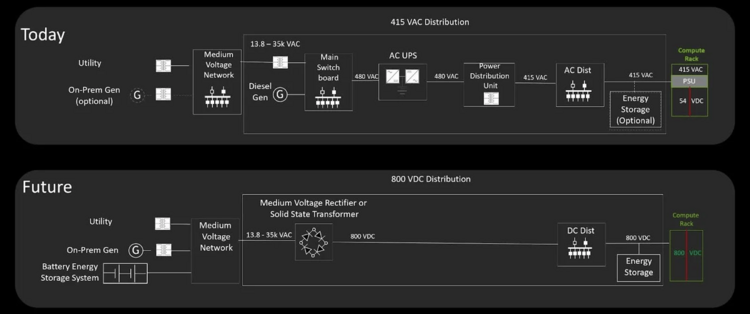 图1:英伟达从415伏交流(上)到800伏直流(下)的配电架构演进