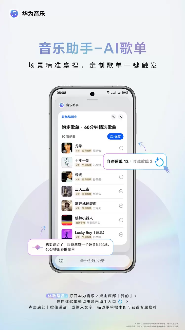 你是否厌倦了千篇一律的推荐歌单?是否在为找不到适合特定场景的音乐而烦恼?华为音乐的“AI歌单”功能,基于小艺智能体平台先进的自然语言处理模型,能够结合你的听歌历史、偏好、情景、心情等多维度数据,精准定制个性化歌单。无论是户外跑步、派对狂欢,还是深夜加班、周末大扫除,只需在华为音乐-我的中找到“智能圆圈图标”,点击唤醒音乐助手,长按底部栏说“我要跑步了,帮我生成一个适合5.5配速、60分钟跑步的歌单”,很快一张专属歌单便新鲜出炉,支持一键保存,彻底告别繁琐的查找操作。它还会根据你的反馈动态调整,越用越懂你!从此找歌不再费神,每个人都能轻松拥有“音乐私人定制”。