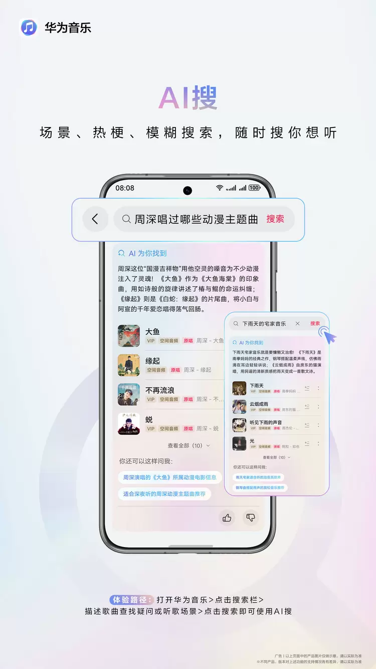 相信不少人都有类似困扰:依稀记得“2025年春晚有首好听的歌曲”“周深唱过的动漫主题曲”,但就是想不起歌名。华为音乐的“AI搜”功能,依托强大的跨域内容知识库和大模型语义理解等能力,能秒懂需求并精准找到那首“说不出名字但就是想听”的歌;基于角色、情节、画面等产生的需求,都能被转化为对应的歌曲列表。