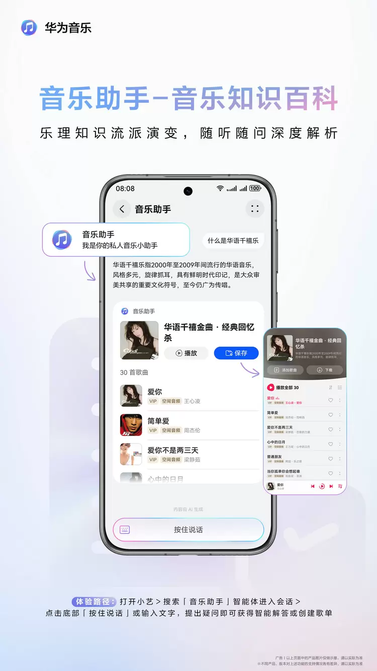 对于音乐爱好者来说,了解歌曲背后故事往往能让听歌体验更加丰富。华为音乐全新推出的“音乐知识百科”功能把“音乐老师”装进手机,专业的音乐垂域知识库可以为用户解答涵盖歌曲创作背景、乐曲解析、古典结构分析、艺术家生涯、流派演变乃至幕后制作故事等专业内容。当你听到一首感兴趣的歌曲时,前往小艺智能体广场找到音乐助手,问一句“这首歌的创作背景是什么”“这位歌手还有哪些代表作”或具体问出“什么是华语千禧乐”等,它能迅速给出清晰易懂的解答,并同步推送相关的歌曲列表,歌曲同样能一键保存至华为音乐,成为你的自建歌单。这种“边听边学”的体验,让音乐小白也能轻松秒懂,深度感受音乐的魅力。
