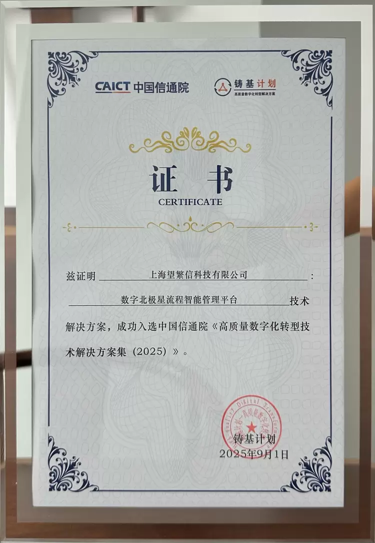 作为中国信通院“铸基计划”的阶段性成果之一,《高质量数字化转型技术解决方案集2025》与《高质量数字化转型产品及服务全景图2025》汇聚了全国范围内的优质实践与领先厂商,旨在为各行业企业提供可参考、可复制的数字化转型路径。望繁信科技凭借在流程挖掘与流程智能领域的持续深耕成功入选,标志着其技术创新能力与应用实践价值获得行业权威认可。