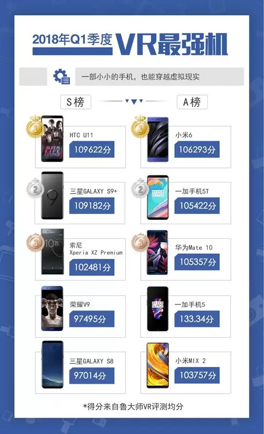 鲁大师2018年VR手机榜发布:小米6、HTC U11各占半壁江山!