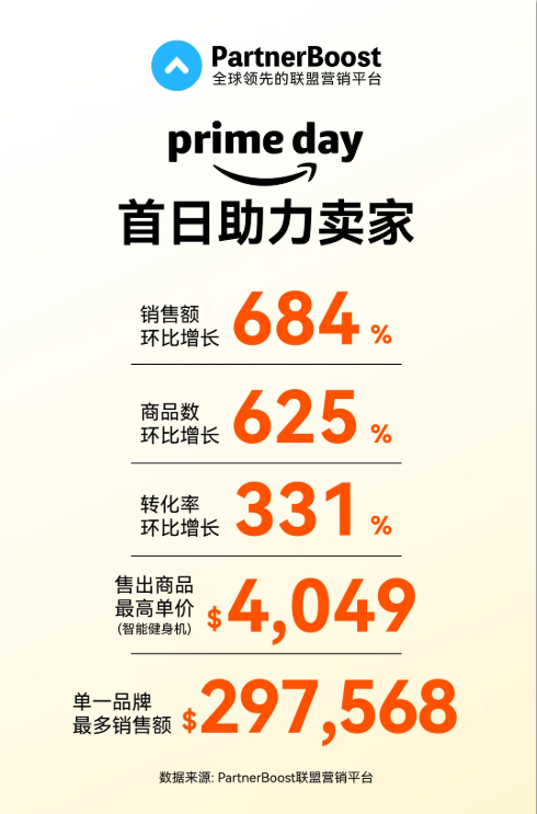 Prime Day大促落幕,一份来自PartnerBoost的联盟营销战报已然出炉:使用PartnerBoost联盟营销的卖家在大促首日即斩获684%的惊人增长,其中单品牌最高日销售额突破$297,568,单笔订单金额高达$4,049。