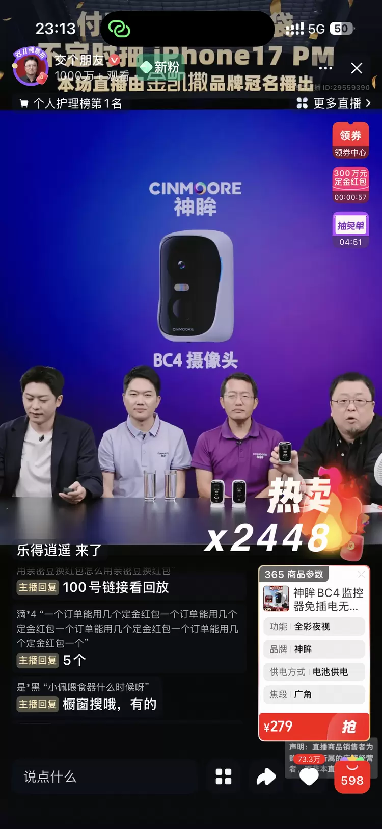 本次直播恰逢淘宝双十一活动首日,神眸BC4系列产品的技术创新和实用功能赢得了消费者的广泛认可。直播期间,观众对产品“不接电、不接网”的便捷安装特性表现出浓厚兴趣,特别是BC4 Pro+的双镜头设计和AI智能识别功能成为讨论焦点。