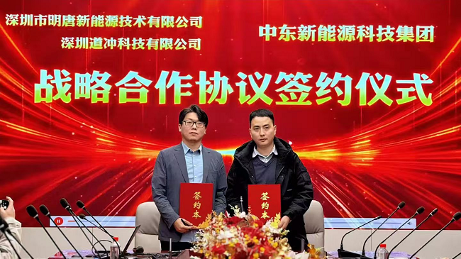 2025年10月23日,中东新能源科技集团(简称“中东新能源”)与深圳市明唐新能源技术有限公司、深圳道冲科技有限公司经过深入洽谈,正式签署战略合作协议。开启三方在绿色能源项目落地与智慧出行产业升级的协同合作,为行业资源整合与生态构建注入新动能。
