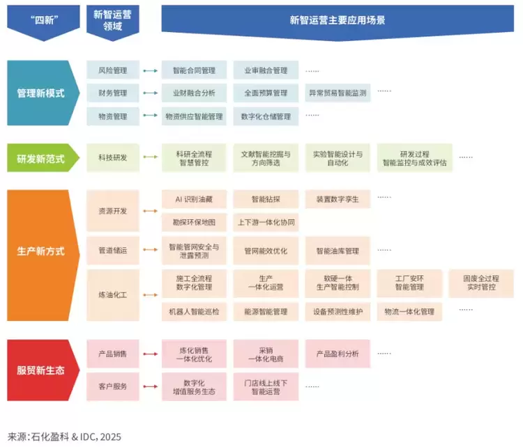 《白皮书》首次系统性地提出了“新智运营”概念。石油石化新智运营,是指以数字化、智能化技术为基石,以“智能感知、智能平台、智能决策”为核心能力,通过贯通资源开发、管道储运、炼油化工、产品销售及客户服务等产业环节,深度融合多源数据与工业知识,系统构建“数据×知识”双轮驱动、协同高效的新型运营体系。该体系旨在推动形成管理新模式、研发新范式、生产新方式与服贸新生态,持续为石油石化企业感知赋值、认知赋智、应用赋能,最终实现创新引领、全链协同、本质安全、绿色低碳和全球卓越的高质量发展目标。