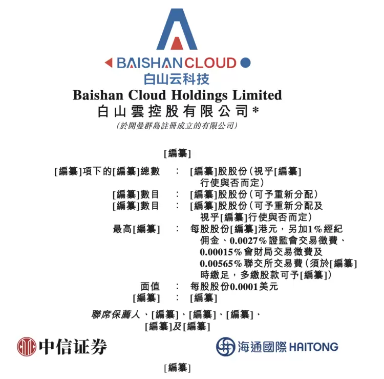 10月24日消息,白山云控股有限公司(以下简称“白山云”)于近日向港交所递交主板上市申请,中信证券与海通国际担任联席保荐人。