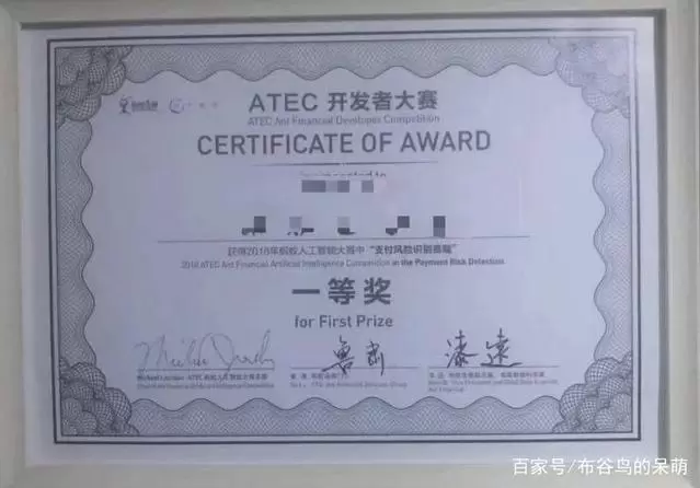 据说,这个程序猿和领导请了两三天的假,领导以为他要去相亲过中秋什么的,也没有在意,谁知上班后他告诉领导拿了个大奖,奖状上面写了蚂蚁CTO的大名,如假包换,领导惊了!同事评价这个程序猿平常的工作室数据挖掘,给360金融的argus风控引擎做建模,平时也腼腼腆腆的。