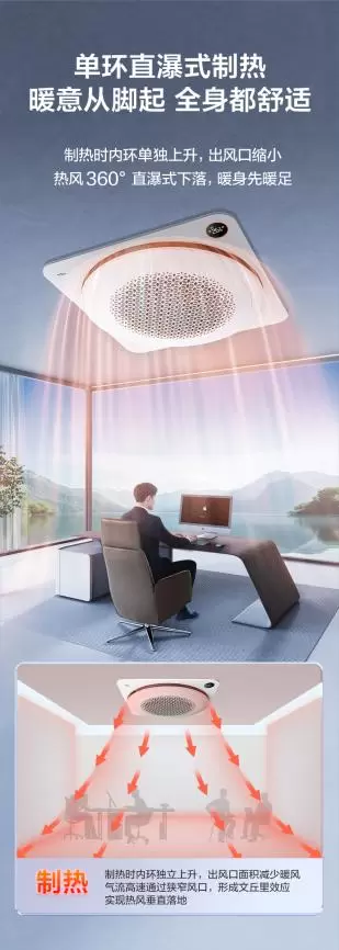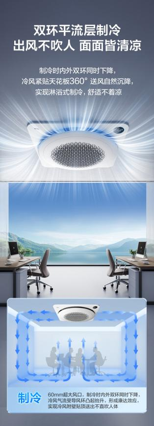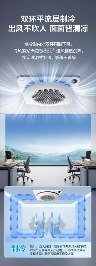 传统天花机普遍存在冷风直吹、暖风不落地、细菌易滋生导致难闻异味等痛点,而TCL小蓝翼天花机通过技术的全面升级,提升用户舒适体验。其中,全域舒适风就是一大亮点,常规天花机四面出风有死角,但TCL小蓝翼天花机能实现360°冷暖全覆盖,每个角落都是想要的温度。其创新采用圆形内外双导风环设计,拥有2100m3/h超大循环风量,无论是制冷还是制热都舒适。