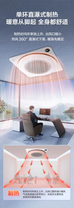 制热时,单环直瀑式暖风制热技术则展现出独特优势。内环单独上升,出风口缩小,暖风气流高速通过狭窄风口,形成文丘里效应,热风360°直瀑式下落,让用户从脚底开始感受到温暖,全身都舒适。这种设计充分考虑了人体对温度的感知特点,为用户营造了更加贴心的温暖环境。