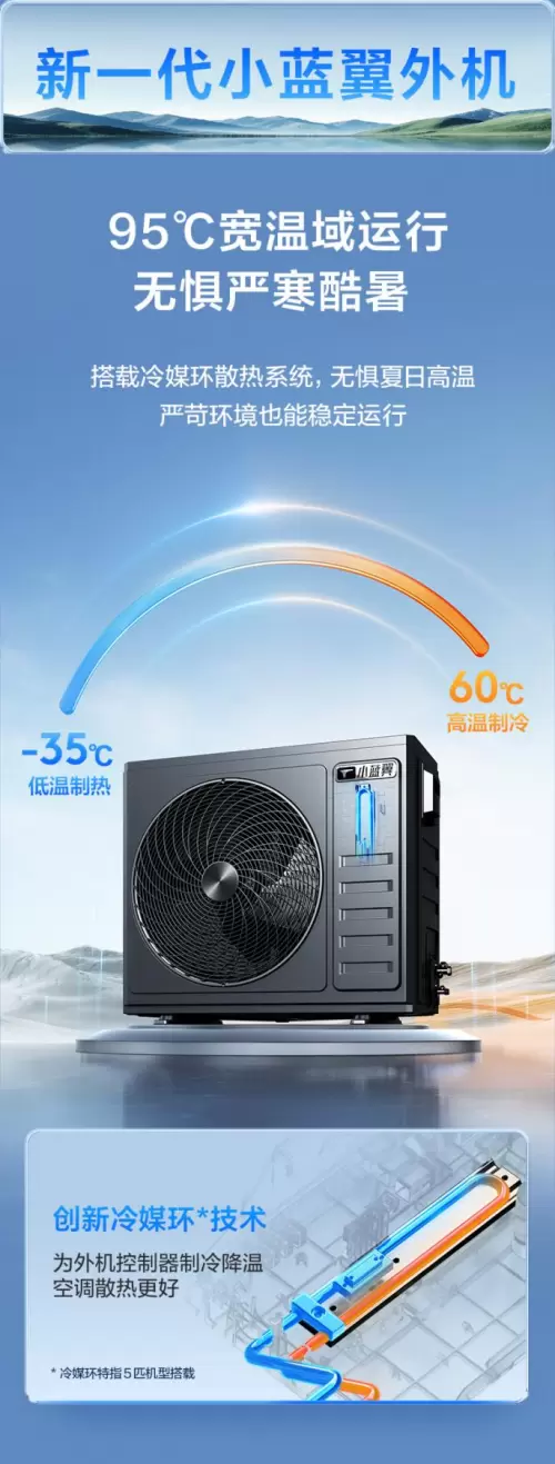 配备新一代小蓝翼外机,95℃宽温运行,无惧严寒酷暑