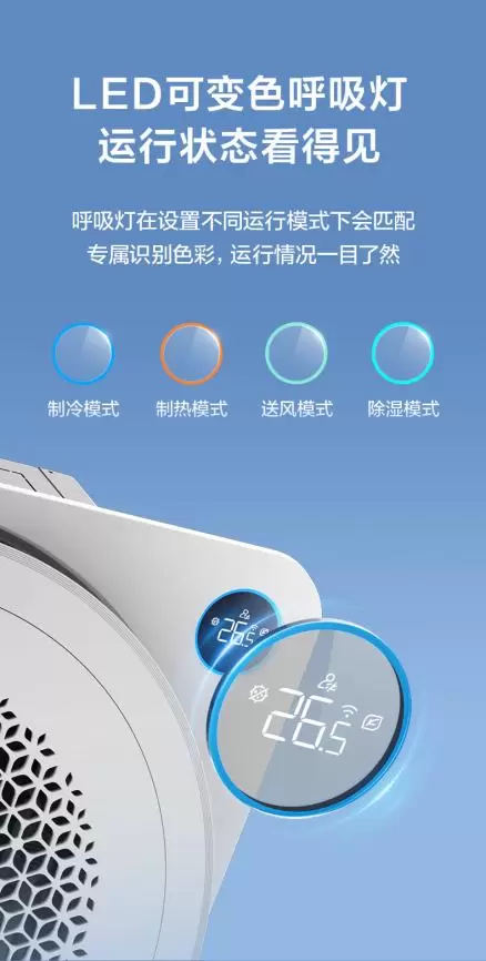 TCL小蓝翼天花机在细节设计上也十分用心,采用全闭合出风面板,外观简洁精致,拥有200mm的超薄机身,安装更美观,能够与各种装修风格完美融合。LED可变色呼吸灯在不同运行模式下会匹配专属识别色彩,运行情况一目了然,让用户随时掌握空调的工作状态。