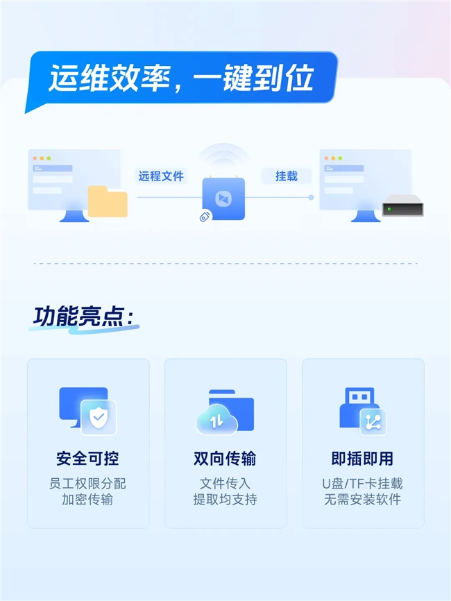 但现在,这些场景都能被一台贝锐向日葵Q2Pro 轻松改写。全新的 「远程文件传输」功能,让运维人员在获得授权后,即可跨越空间与网络限制,高效、安全地完成日志采集、程序更新、应急排障与远程协助。即插即用,无需安装软件,不依赖被控设备网络,Q2Pro让“无网远控”真正落地。