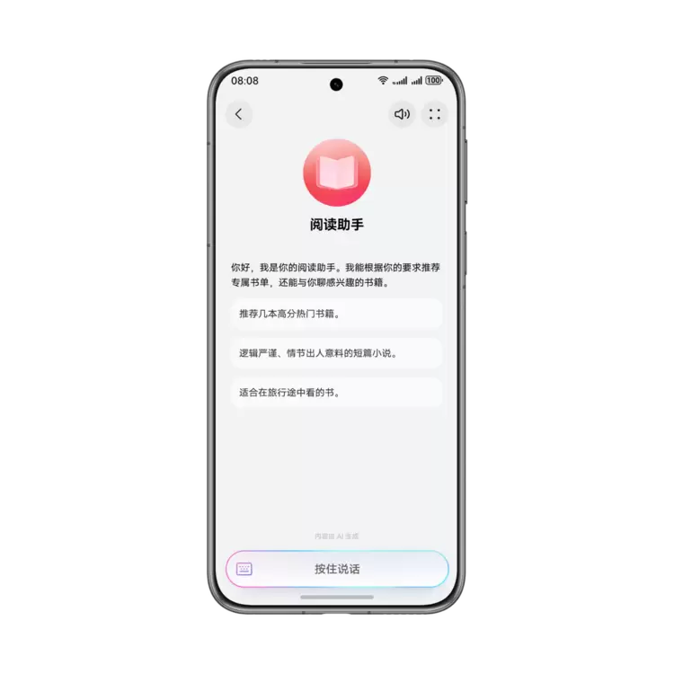 华为阅读通过鸿蒙操作系统的AI能力,打通百万书库,在书籍搜索层面突破传统关键词检索局限,通过AI理解用户意图,智能推荐符合用户需求的书籍。阅读助手可以针对用户提出的问题,分析用户喜好,推荐符合提问者需求的书单,例如,用户对阅读助手说“推荐几本高分热门书籍”、“想看逻辑严谨、情节出人意料的短篇小说”、“适合在旅行途中看的书”等,只需要简单描述读书的场景或类型需求,阅读助手就可以精准匹配呈现对应的内容或书单,点击推荐书籍列表即可直接一键阅读。阅读助手犹如一位博学的领读人,帮助用户严选好书。