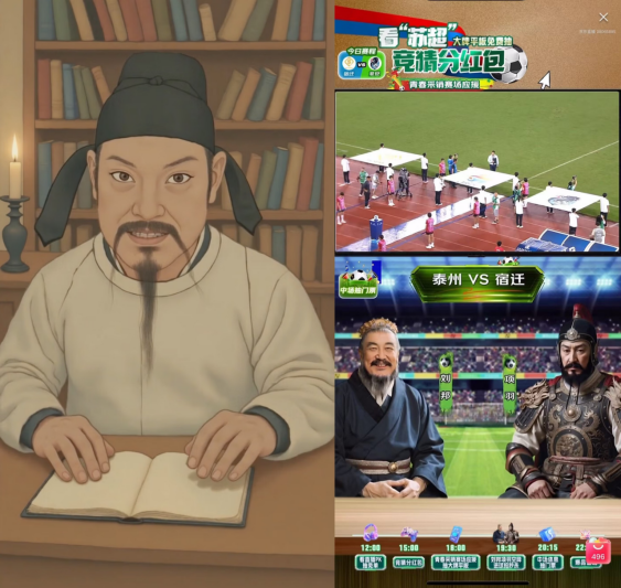 此外,京东也将其他虚拟形象成功引入直播场景,并通过技术的深度优化,赋予其自然流畅的表情、动作,营造出极具“真人感”的交互体验。比如在直播间推出 “李白卖书” 趣味形象,让传统文化与商品营销碰撞新火花;在京东头号玩家“苏超”专场直播中,“项羽、刘邦” 化身解说员陪用户观赛,强化内容趣味性。