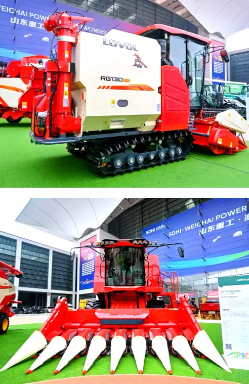 收获机械区域同样亮点纷呈:雷沃GV100多功能收割机如同“变形金刚”,通过切换不同割台,轻松实现稻麦、玉米、大豆、青稞、油菜等多作物收获;雷沃GK120大型单纵轴流收割机以其作物喂入顺畅、脱粒干净的特性,成为大农场作业的首选;而雷沃RG130大型水稻收获机则专为水田设计,配备智能仪表、空调驾驶室和高清摄像头,驾乘舒适,安全可靠。