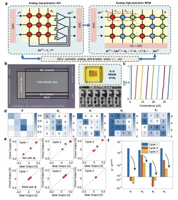 整个系统的控制也经过精心设计。LP-INV电路板包含8×8 RRAM阵列、运算放大器、模拟开关、多路复用器、DAC和ADC。HP-MVM则是一个完全集成的芯片,包含1Mb RRAM阵列、跨阻放大器、ADC、模拟开关、多路复用器和寄存器。所有这些组件通过个人电脑协调工作,实现了从硬件到算法的完美配合。