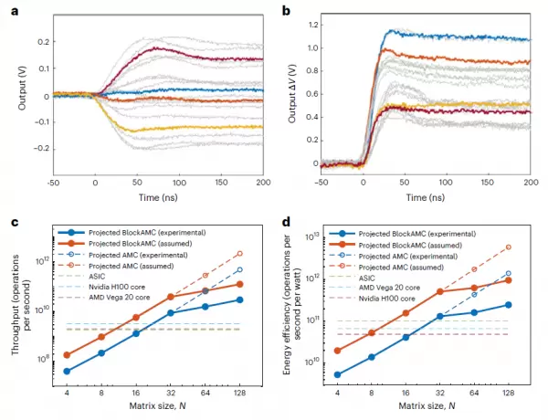 研究团队对系统的瞬态响应进行了详细测量。对于4×4矩阵,模拟INV电路在120纳秒内就能收敛到稳定解,MVM操作的响应时间约为60纳秒。这个速度取决于运算放大器的增益带宽积和矩阵的最小特征值,而不是矩阵大小,这意味着时间复杂度实际上接近O(1)。