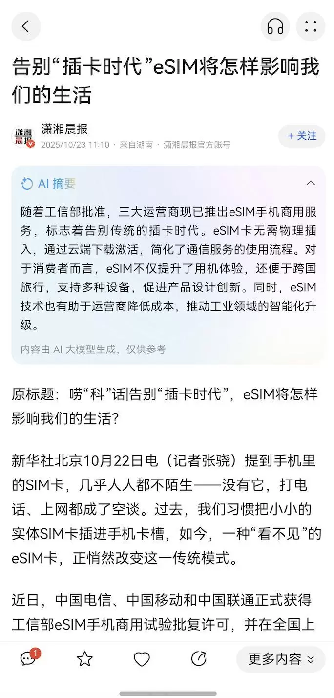 基于媒体资讯报道与AI摘要提炼,用户如需进一步了解感兴趣的内容与方向,可以通过AI问答功能继续提问,例如“eSIM卡什么时候会全面推广”、“eSIM的优势”等,系统会基于官方媒体、专业机构等权威信源给出结构化解答,为用户带来更全面、透彻的理解。不论是金融、医疗还是科技领域内容,用户都能借助浏览器资讯助手持续获取深度分析。