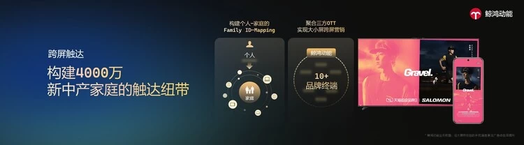 在精准捕捉决策信号的基础上,如何将这些洞察转化为自然而然的交互体验,是品牌与用户建立深度联结的关键。在本次大会上,鲸鸿动能重点介绍了今年新推出的“Family Reach”跨屏场景营销解决方案。该方案通过整合OTT主流平台资源,构建个人HUAWE ID与家庭Family ID的有效映射,真正实现了“大屏曝光+小屏转化”的营销闭环。
