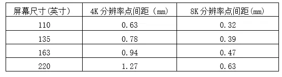 表1:不同尺寸LED显示屏4K、8K显示点间距需求