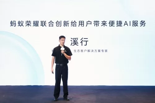 蚂蚁支付宝生态客户解决方案架构师溪行,介绍了荣耀与支付宝在AI智能互联的合作与探索,充分肯定AI时代流量入口重塑背景下,与荣耀积极探寻新生态路径的价值。