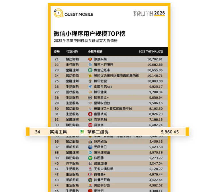 根据数据机构 QuestMobile 2025年7月份发布的《QuestMobile2025半年度中国移动互联网实力价值榜》,在“微信小程序用户规模TOP榜”中,草料二维码以5860.45万月活跃用户,排名全国第34位,超越肯德基、腾讯理财通等知名小程序,仅次于拼多多。