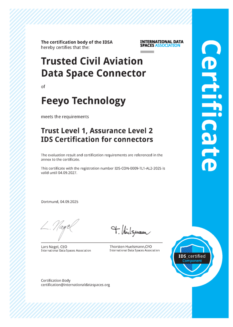 飞友科技民航可信数据空间连接器(TCADSC)获得国际数据空间(IDS)认证
