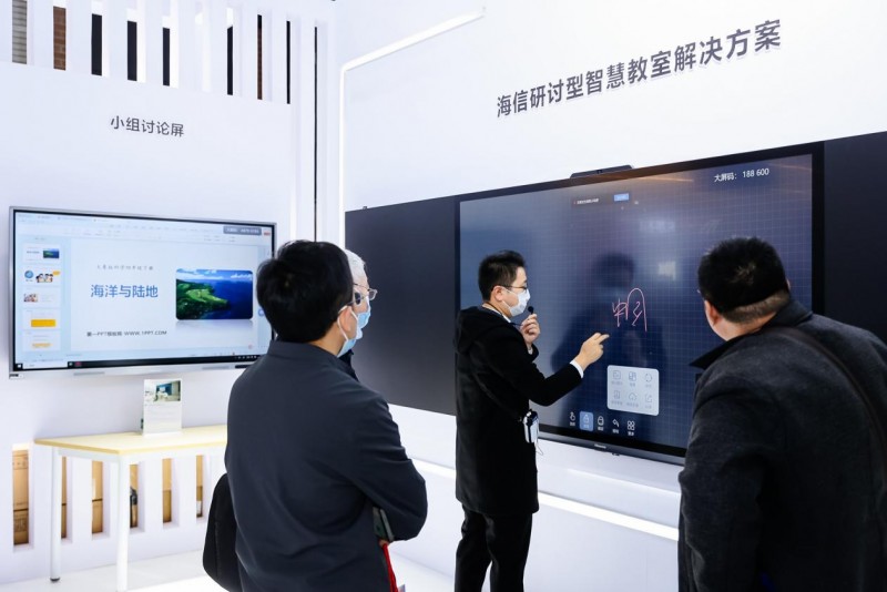 展会现场,针对传统研讨型教室互动形式单一、教学效果有限的难题,海信商用显示推出了研讨型智慧教室解决方案。该方案由教师屏、小组屏与研讨软件共同组成,支持屏幕广播、组内协作、成果对比等丰富互动功能,有效促进师生高效互动,提升学生课堂参与度与学习成效。
