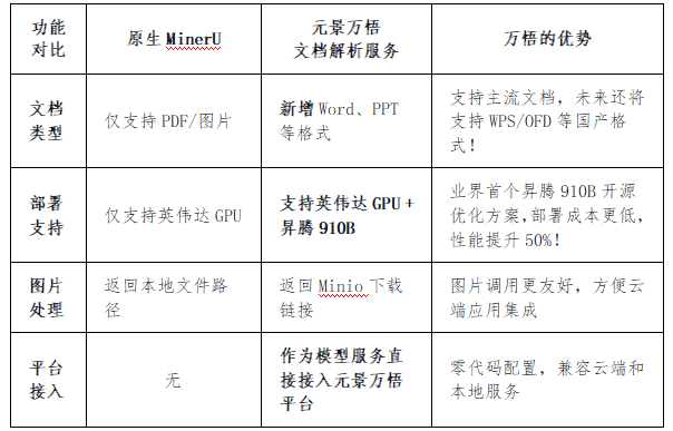 联通元景万悟智能体开发平台基于原生MinerU,做了四大核心升级,实现了效率和性能的双重提升!对比分析如下: