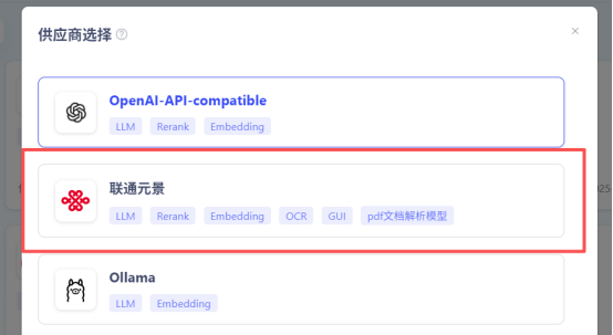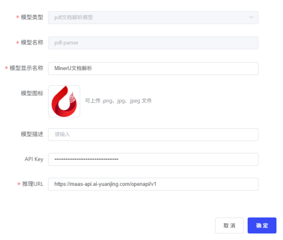 (1)导入服务:在元景万悟平台的【模型管理】中,新建模型服务,选择“联通元景”供应商。可接入云端或本地服务:【接入云端服务】接入联通元景MaaS平台云端的MinerU服务,配置URL及API key等信息即可完成接入(可前往https://maas.ai-yuanjing.com/ 申请API Key)。