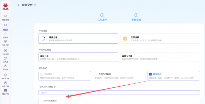 (2)开启使用:在【知识库】中导入文件,解析方式选择【模型解析】,并选择已导入的MinerU服务,即可享受强大的解析能力!