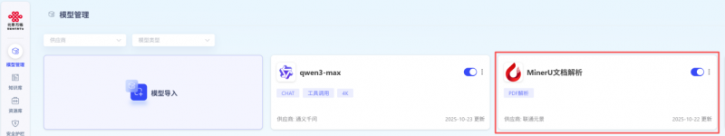 点击确定后,回到模型管理列表中可以看到刚才接入的:MinerU文档解析服务,表示已经接入完成。