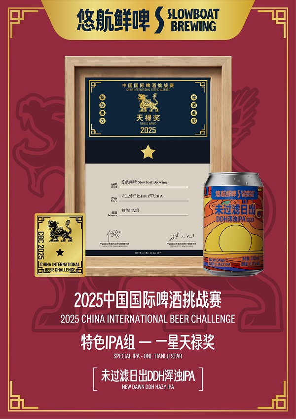 中国精酿领域的领军品牌之一悠航鲜啤,近日在刚刚落幕的2025年度中国国际啤酒挑战赛(CBC)天禄奖评选中,其旗下四款精心酿造的啤酒从众多参赛酒款中脱颖而出,勇夺四项大奖。其中,「橘儿踪DDH双倍IPA 」凭借其卓越的品质,斩获大赛四星奖;「猴拳IPA」荣获二星奖;同时,「曹台班子IPA」与另一款酒「未过滤日出DDH浑浊IPA」双双摘得一星奖。此次获奖,是行业权威机构对悠航鲜啤不懈追求酿造技艺与极致风味的又一次高度肯定。
