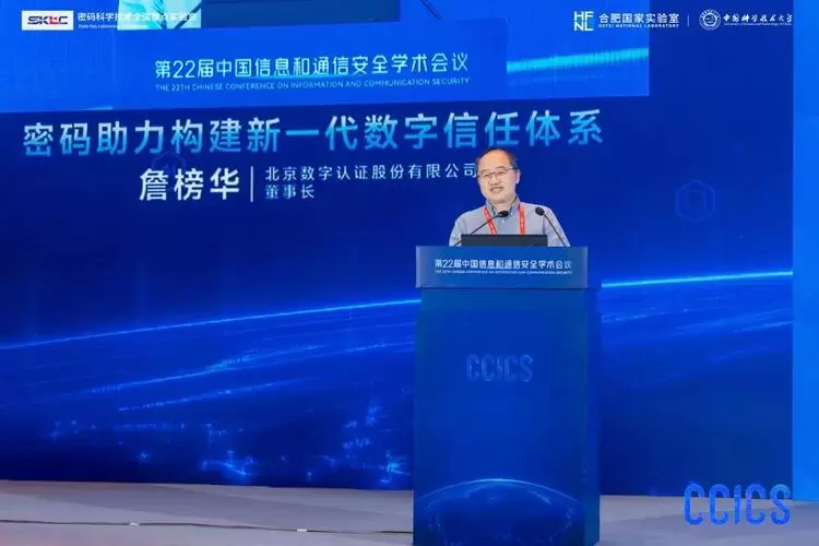 10月23日,第22届中国信息和通信安全学术会议在安徽合肥隆重召开。本次会议由密码科学技术全国重点实验室主办,合肥国家实验室、中国科学技术大学承办。北京数字认证股份有限公司董事长詹榜华受邀出席,并于现场发表了“密码助力构建新一代数字信任体系”的主题演讲。