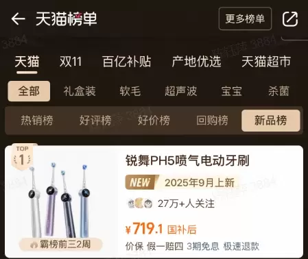 在今年双十一的开门红活动中,锐舞电动牙刷凭借其独特的创新技术,取得了令人瞩目的市场表现。产品开售后迅速成为消费者关注的焦点,销售额于短时间内即达到可观量级,并成功跻身主流电商平台电动牙刷新品销量榜第一,展现出其作为2025年市场新锐的强大竞争潜力。