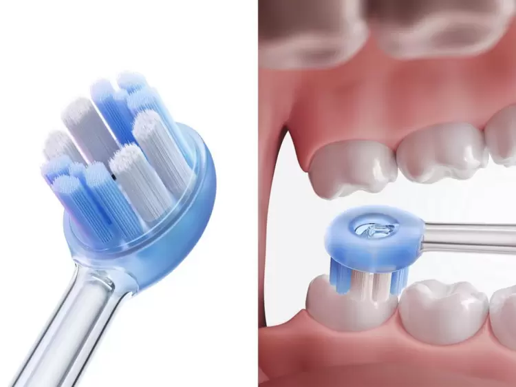 该刷头尺寸为市面最小——长17.5mm、宽14mm,小巧设计使其能灵活深入后牙区,彻底清洁难以触及的后槽牙位置,全面消除口腔盲区。